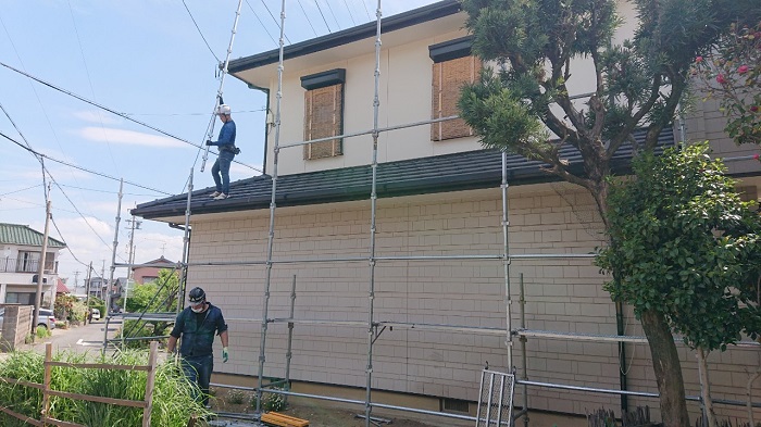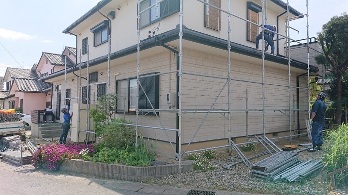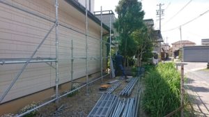 こんにちは、本日は岡崎市と蒲郡市にて仮設足場設置工事を行いました。写真は仮設足場設置作業時のものです。仮設足場工事は危険な作業なので、労働災害を防止するための法令があります。一般規模の住宅の塗り替えに必要な仮設足場に関する法令は以下のようなものがあります。