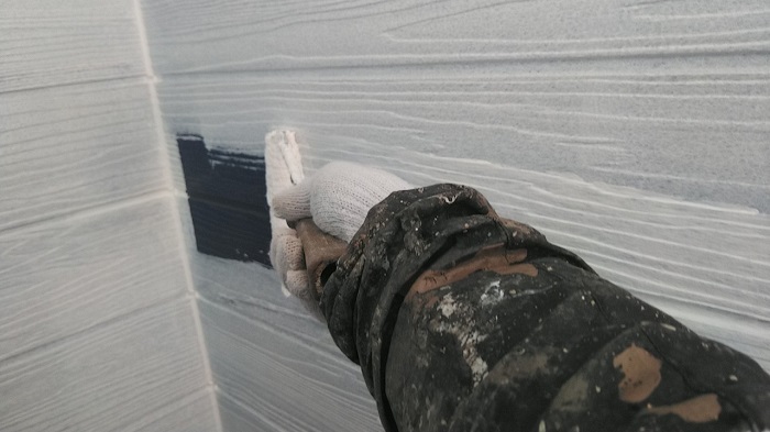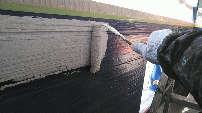 こんにちは、本日は岡崎市にてお家の塗り替え工事を行いました。写真は、外壁の下塗り作業時のものです。下塗り材の微弾性フィラーは既存塗膜表面の浅い細かいひびわれ(ヘヤークラック)を埋めることができます。材料は、日本ペイントの窯業系サイディングボード改修用下塗材、パーフェクトサーフを使用致しました。この下塗りを行った後に中塗り、上塗りと作業を進めていきます。