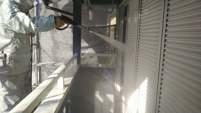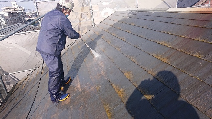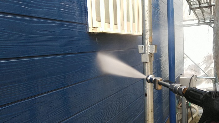 こんにちは、本日は岡崎市にて住宅の高圧洗浄工事を行いました。写真は高圧洗浄時のものです。仮設足場組立工事を終え、次の工程で高圧洗浄作業をさせて頂きます。この工程の後に続くシーリング工事や塗装工事の材料の密着性を高める大切な工程です。