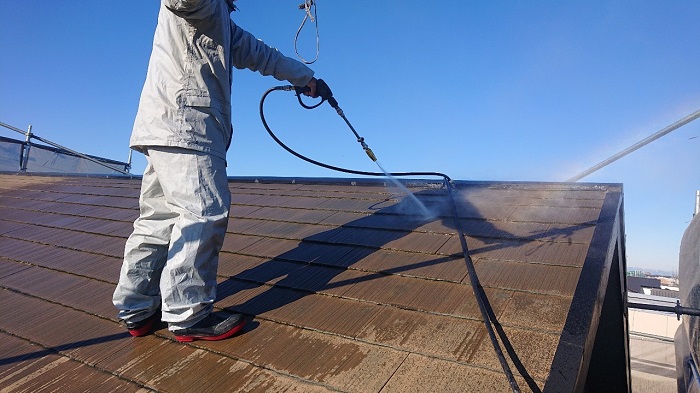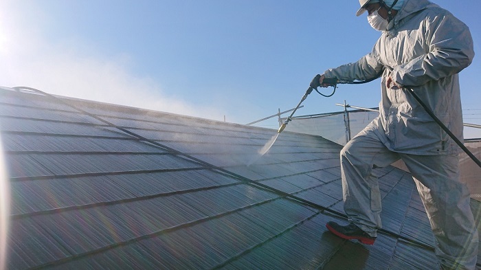 こんにちは、本日は岡崎市にて外壁の塗り替え工事と高圧洗浄工事を行いました。写真は、高圧洗浄作業時のものです。屋根の既存塗膜は経年の紫外線や雨などの影響により、外壁よりも劣化が進んでおりますので、その分時間をかけて下地調整をに行います。