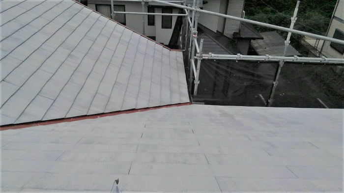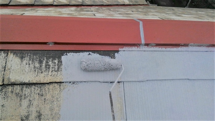 こんにちは、本日は安城市にてアパートの塗り替え工事を2件、豊田市にて屋根の塗り替え工事を行いました。写真はスレート屋根の下塗り作業時のものになります。下塗りの材料は、日本特殊塗料の2液型弱溶剤エポキシ樹脂塗料、エポラマイルドプライマーSを使用、2回目の下塗りの材料は、スズカファインの新生瓦・セメント瓦用 カチオン系合成樹脂エマルション下地調整塗材、ベスコロフィラーHGを使用致しました。上塗り作業に入る前に、プライマーとフィラーを用いて下塗り塗装を2回行い、下地をしっかり作ります。